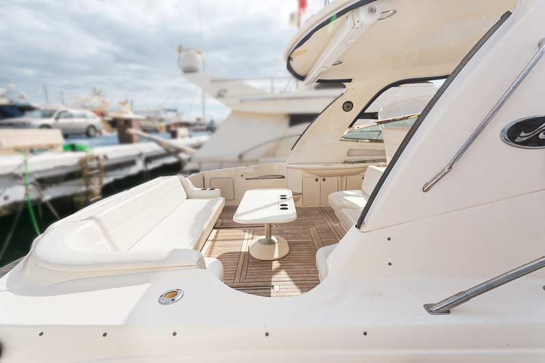 | Plataforma de baño, 2 x paddle surf, aire acondicionado, solarium en proa, bimini, baño completo, música por Bluetooth, cocina equipada, microondas, frigorífico, ducha exterior, 1 dormitorio con cama de matrimonio y 1 doble (sofás convertibles). |